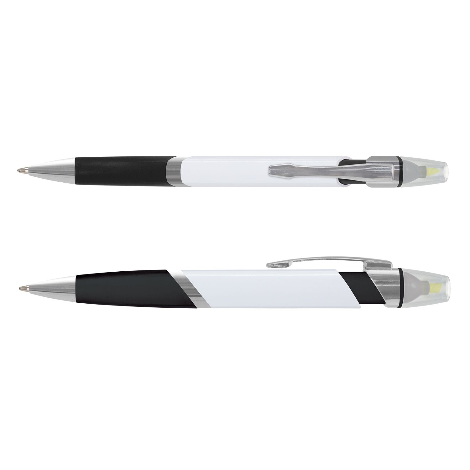 Retractable plastic ballpoint pen with a white barrel, a yellow highlighter, a frosted translucent soft-touch grip and shiny chrome trim. It can be branded in stunning full colour on both sides of the barrel. Avenger has a black refill with 600 metres of German manufactured Dokumental ink.