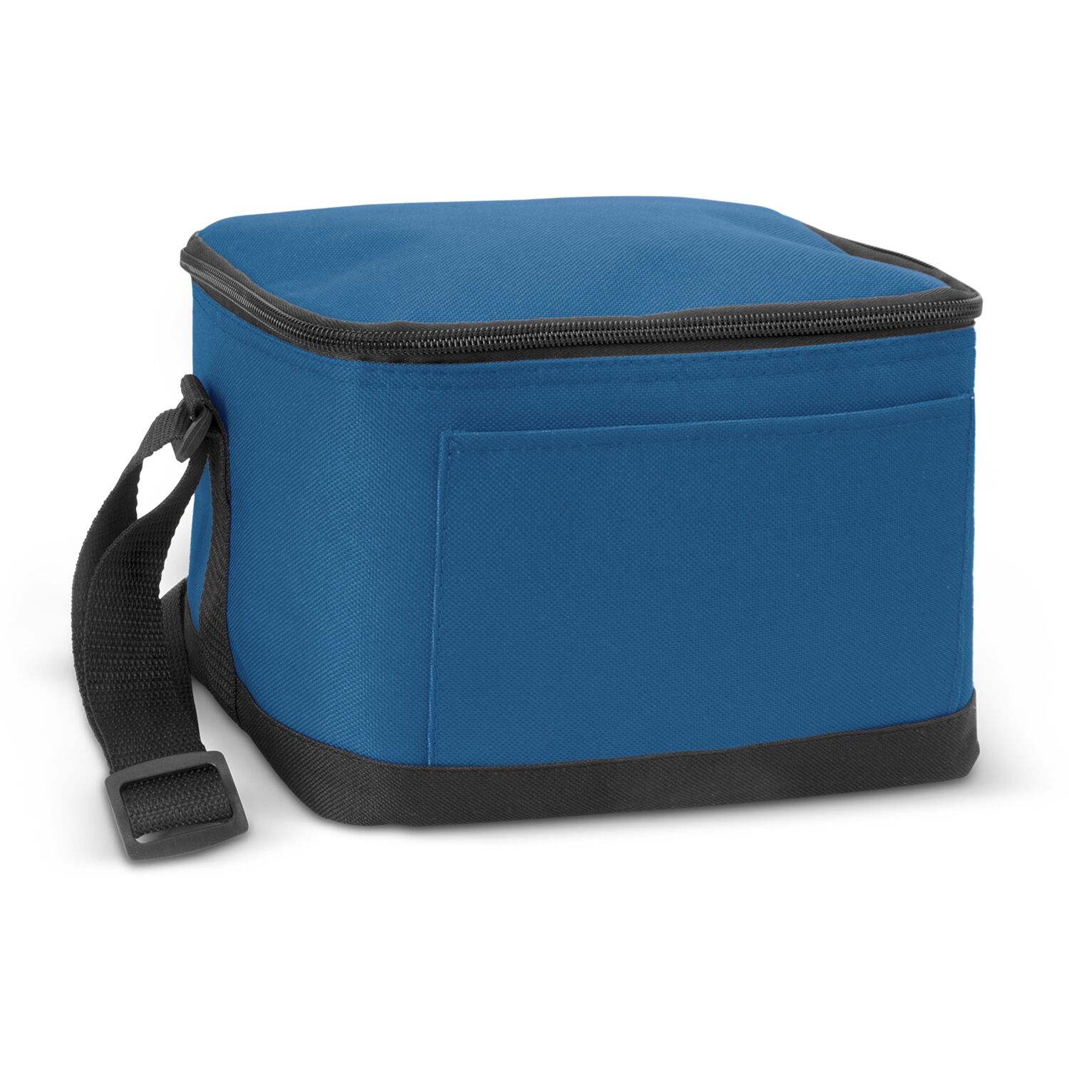 Small 4L cooler bag with PE foam insulation encased in a water-resistant PEVA inner liner. The outer construction is 600D polyester with a zippered top closure, a slip pocket on the front and an adjustable woven shoulder strap.