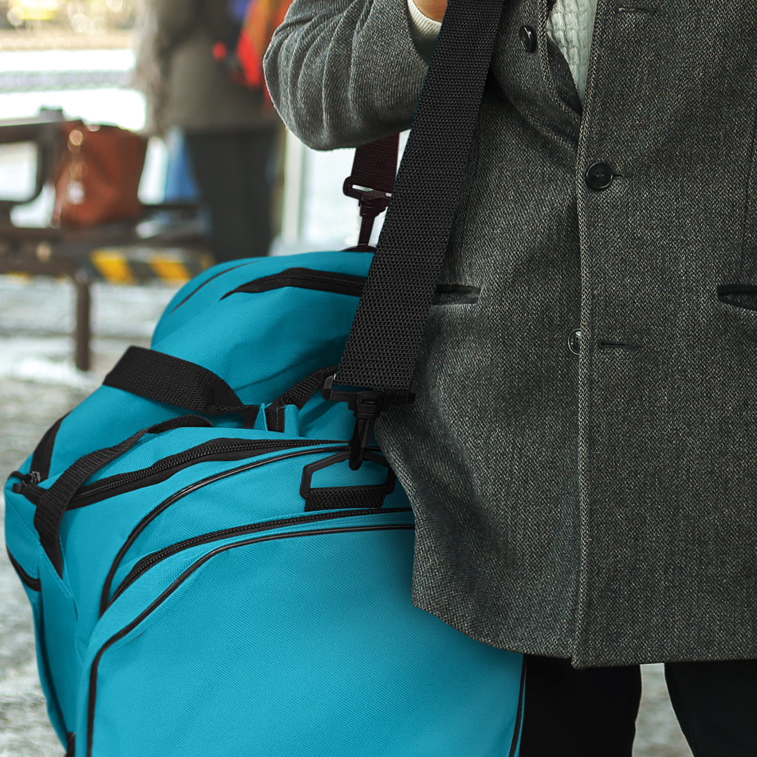 Large duffle bag which is manufactured from 600D polyester. It has an adjustable woven shoulder strap with a curved shoulder pad for maximum comfort. The shoulder strap is removable and the bag also has woven carry handles with a Velcro cuff. Other features include a sturdy reinforced base with plastic feet, three zippered external pockets and two external pockets.