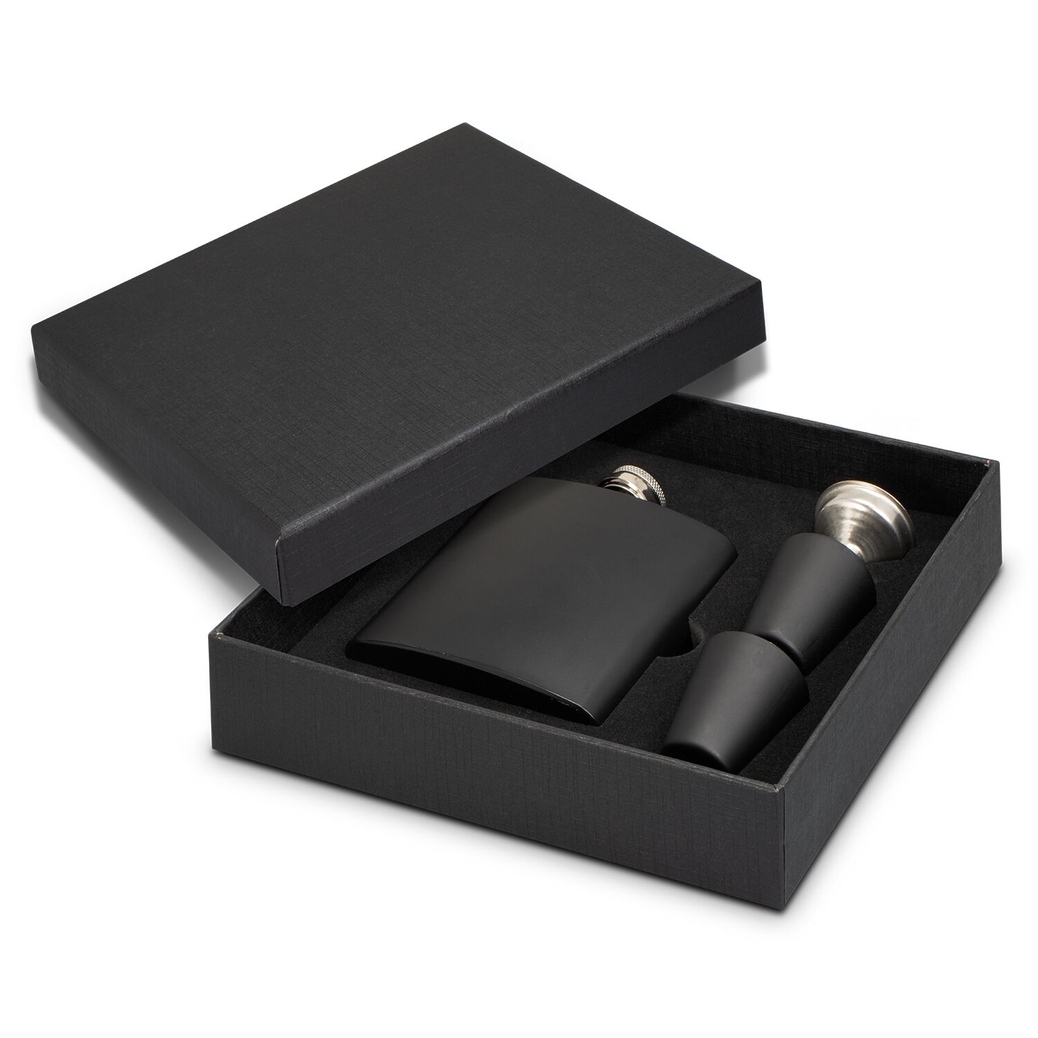 Premium 170ml stainless steel hip flask gift set with two shot glasses and a funnel. It laser engraves to a natural etch and is presented in a black gift box.
