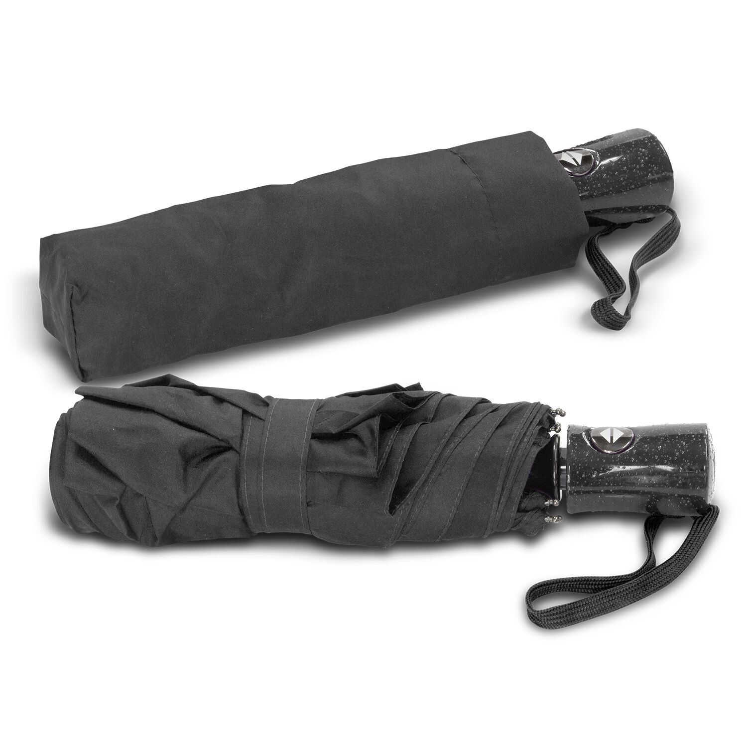 The distinctive Dew Drop tri-folding umbrella has an eight-panel wind-proof pongee canopy which is supported by 53cm fibreglass ribs and a steel shaft. It has automatic opening and a matching pongee sleeve. The plastic handle has a unique raindrop finish and a woven carry loop.