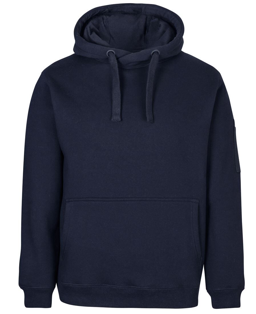 Classic fit | 80% Cotton for comfort, and 20% Polyester for durability | Charcoal Marle/Black: 65% Polyester, and 35% Cotton | 350gsm brushed fleece | Rib hem on cuff and body | Kanga pocket at CF | Pen pocket on left hand sleeve | Fully lined hood in Jersey | Hood with drawcord