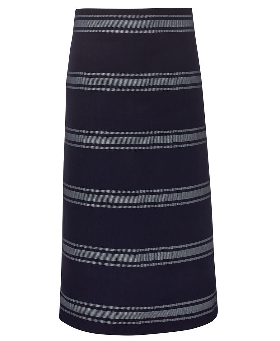 65% Polyester for durability, and 35% Viscose | Yarn-dyed twill weave stripe | Bib style, self fabric neck strap and side ties | Adjustable Bib neck strap with fixed on fasteners | Self-fabric ties | Easy care