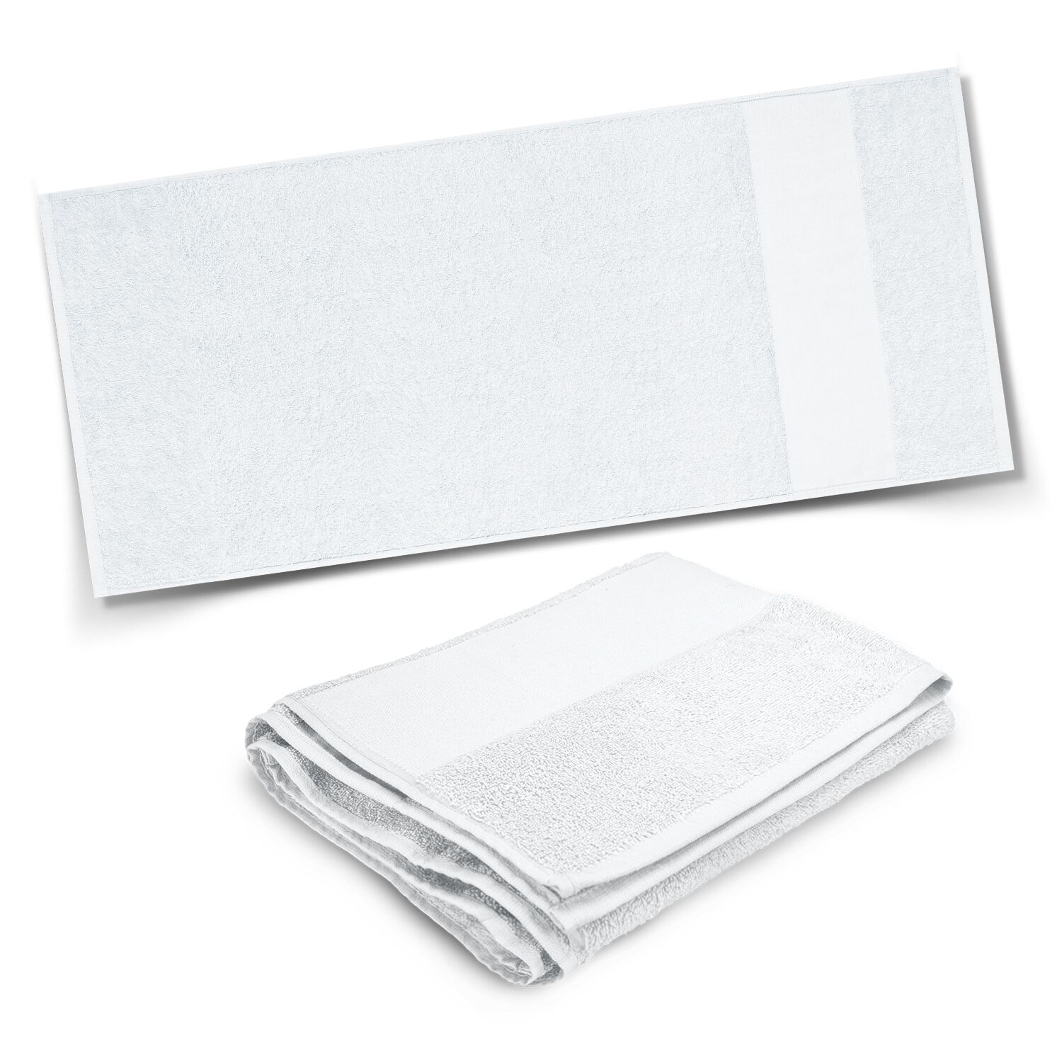Compact 120cm x 60cm towel which is manufactured from soft 350gsm cotton terry towelling. It has a smooth fret area for branding.