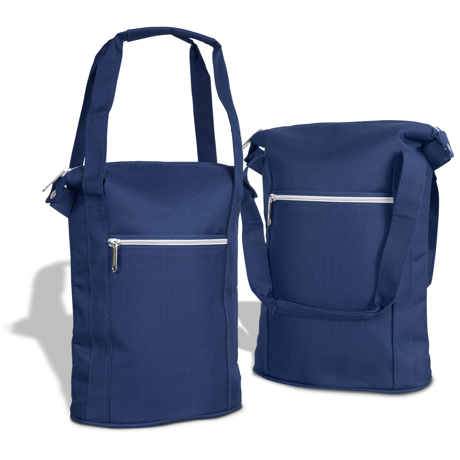 Premium two-bottle wine carry bag which keeps wine cool while in transit. It is manufactured from 600D polyester with PE foam insulation encased in a water-resistant PEVA inner liner. Other features include strong woven carry handles, a zippered front pocket and a zippered main compartment with dome closures to lock the ends away neatly.