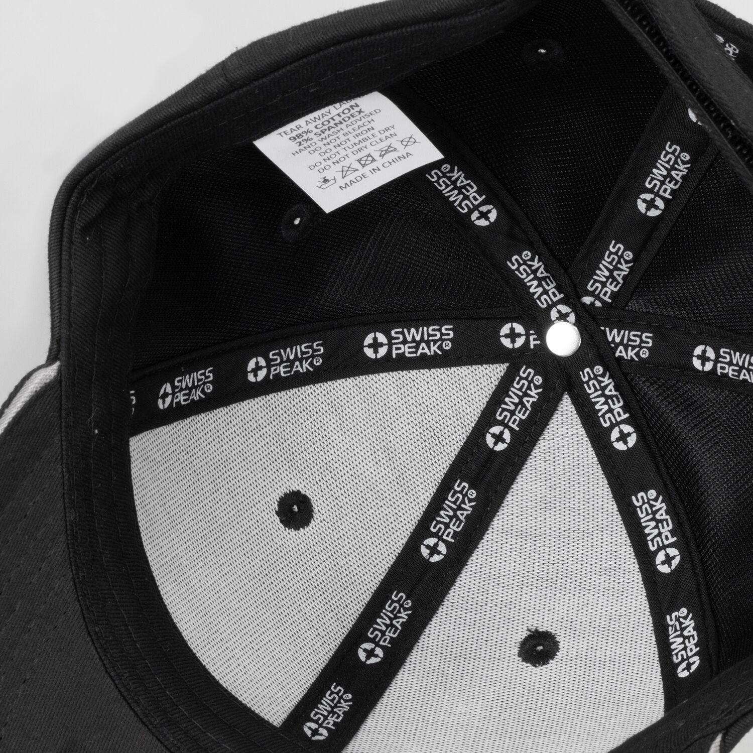 Swiss Peak’s deluxe six panel hat is made of a soft blend of 98% cotton and 2% spandex. The hat features an adjustable Velcro strap with a silicone pull tab, grey accents, and custom Swiss Peak bias tape interior. Available in one size to fit most people, the hat sports a reflective Swiss Peak logo and hang tag.