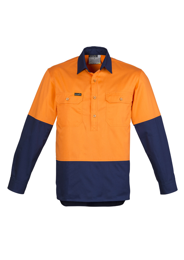 Sizes: XXS – 5XL, 7XL; Fabric: 100% Cotton Twill, 170 GSM; Features: 170 GSM Midweight cotton twill to keep you cool while still being tough enough for any job, Underarm and upper back mesh vent inserts, Buttons run only half way down the shirt to provide greater protection, Two chest pockets with button closures and pen partition, Fade tested;