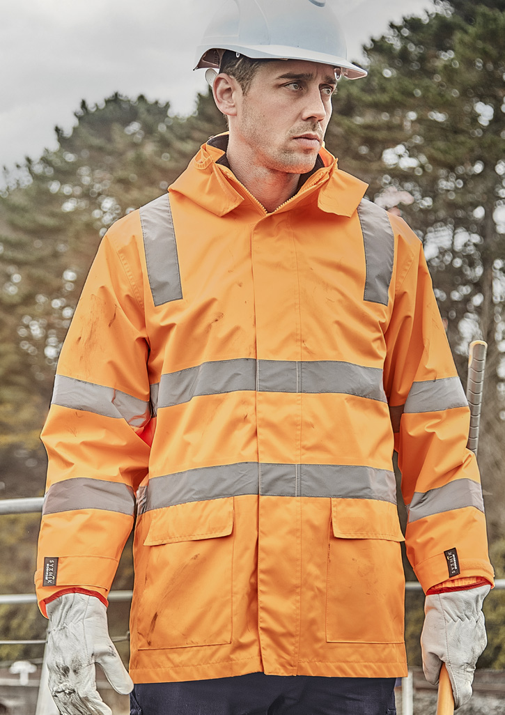 Sizes: XXS – 5XL, 7XL; Fabric: Outer: 100% 300D Oxford Polyester; Jacket Lining: Polyester Mesh, 70 GSM; Vest Lining: Brushed Polar Fleece, 340 GSM; Features: Waterproof and fully seam sealed, Waterproof rating 20,000mm, VIC Rail tape configuration and colour, Reversible vest zips into jacket and can be worn separately or combined, Vest with warm fleece lining, Concealed hood that stores into collar, Storm flap, 2 Waist pockets with flap closures and side hand pockets on outer jacket, Reversible vest with 2 waist pockets, Embroidery access on vest and jacket, Adjustable cuff fasteners;