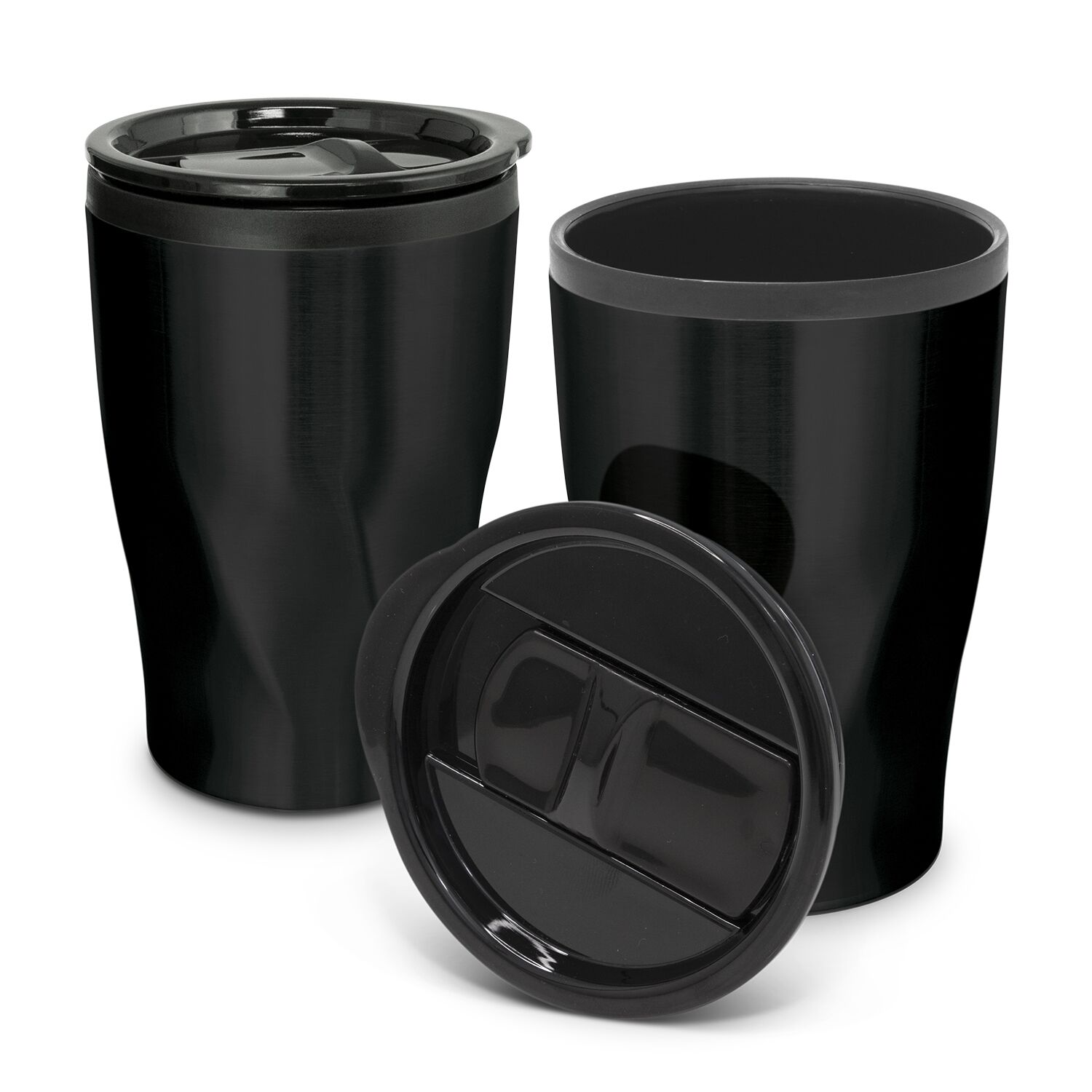 BPA-free 400ml double wall coffee cup which will keep drinks hot for longer. It features a radical twist patterned stainless steel outer wall and a polypropylene inner wall. Tornado has a secure plastic push on lid with a splashproof sliding closure and a soft non-marking base. The black and white cups laser engrave to a shiny steel finish and the silver cups engrave to a natural etch. This product is not dishwasher safe and handwashing is recommended.